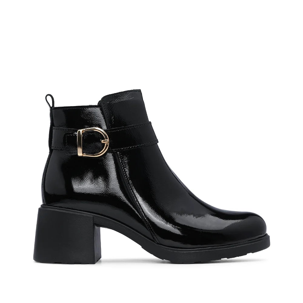 JOANNE BOOTS confeccionada em pele verniz. Com fecho lateral, fivela metálica e sola espessa antiderrapante para um toque de sofisticação e segurança incomparáveis