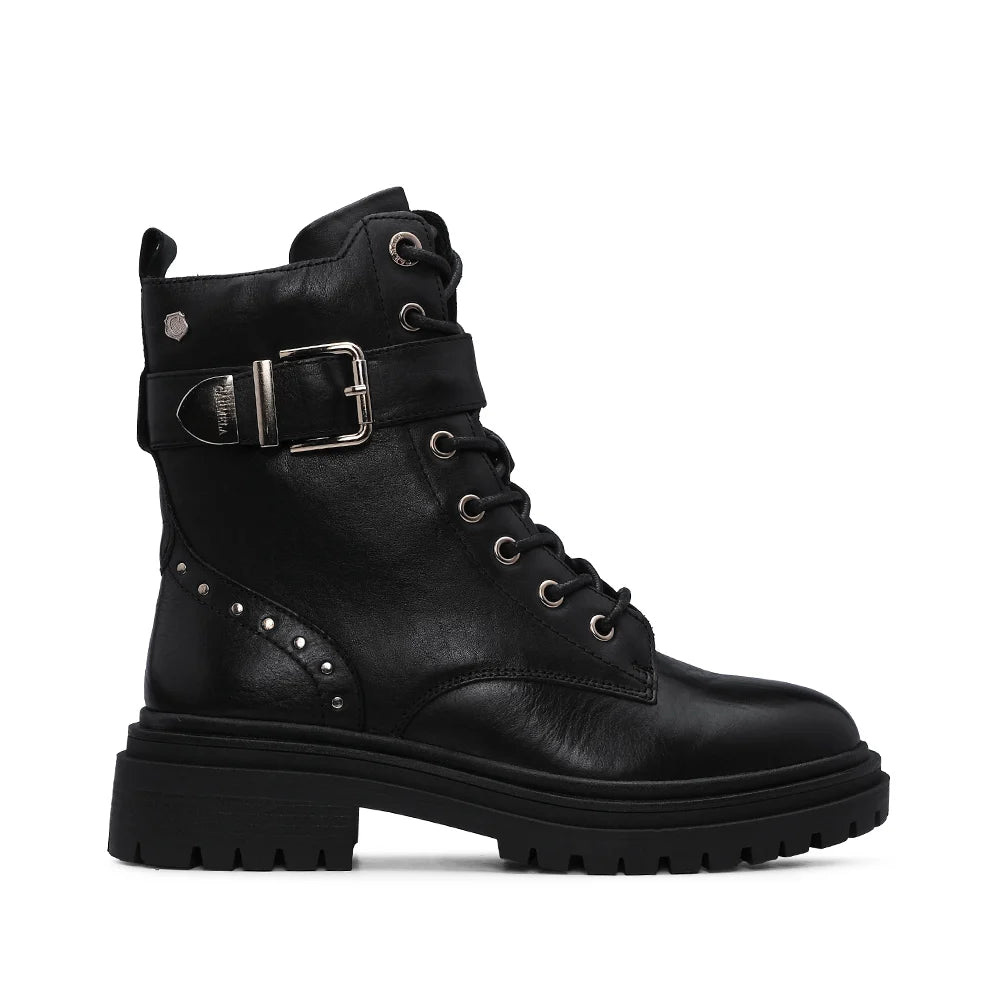 ZAMIA MILITAR BOOTS confeccionada em couro de alta qualidade. Com fecho de zíper lateral e atacadores ajustáveis, possui fivelas metálicas decorativas e sola espessa antiderrapante para um toque de sofisticação e segurança incomparáveis
