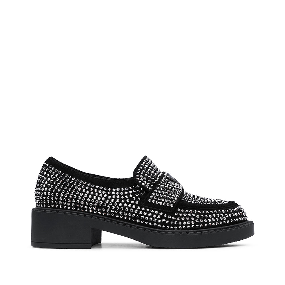 Apresentamos o item indispensável para a estrela do rock estilosa. Estes mocassins pretos apresentam detalhes brilhantes em joias e um salto de 4 cm, tornando-os a combinação perfeita de ousadia e elegância. Mergulhe no luxo com estes sapatos deslumbrantes.